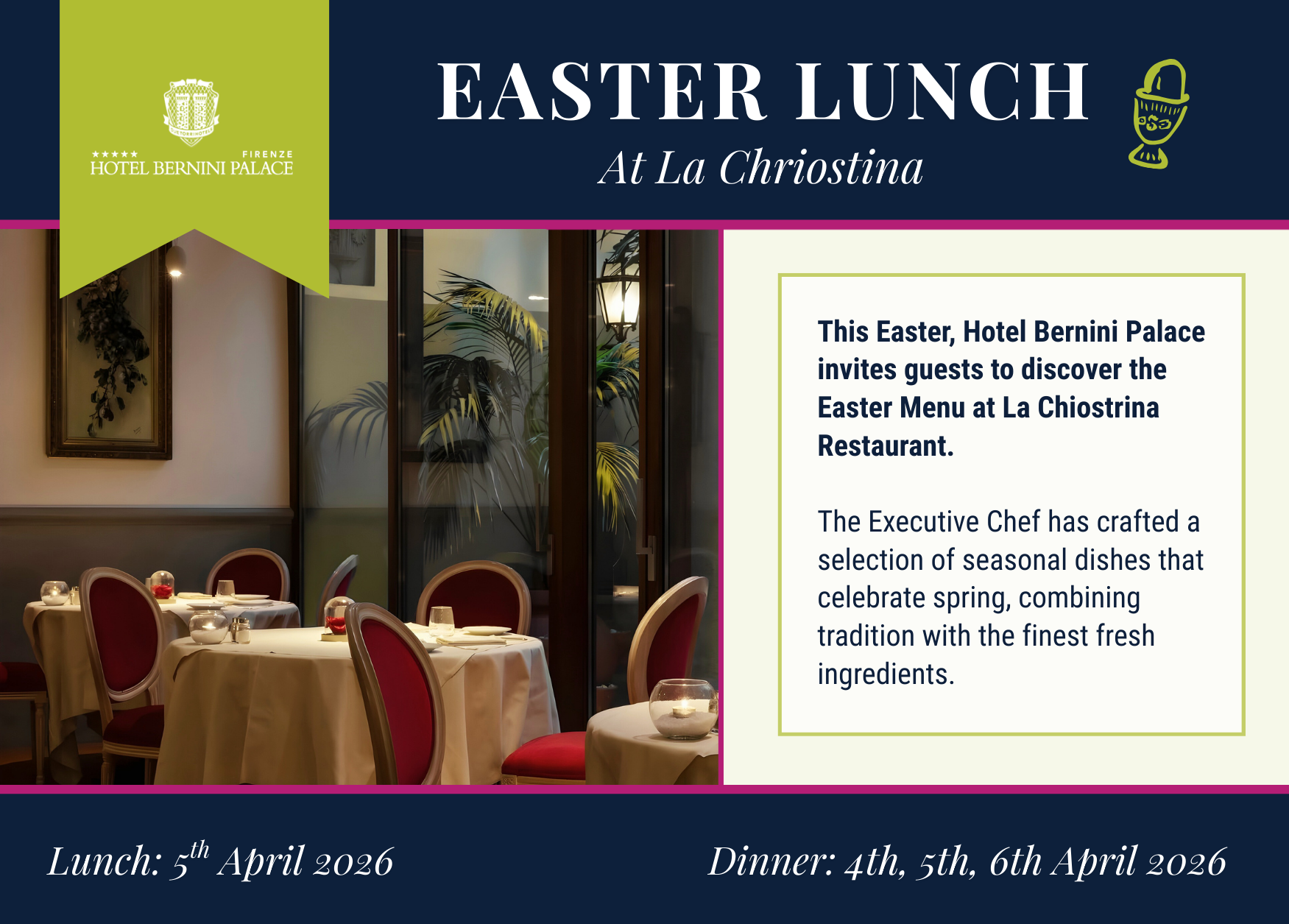 In addition to the à la carte menu, for the Easter Holidays, the Chef suggests...