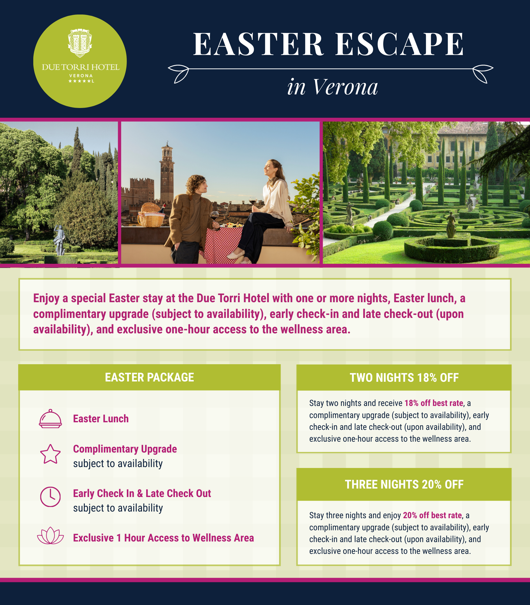 Spring is in the air! Verona is always the most fascinating destination for a city-break: enjoy this romantic city on the occasion of Easter Festivities and spend unforgettable days in the most prestigious hotel of Verona.
